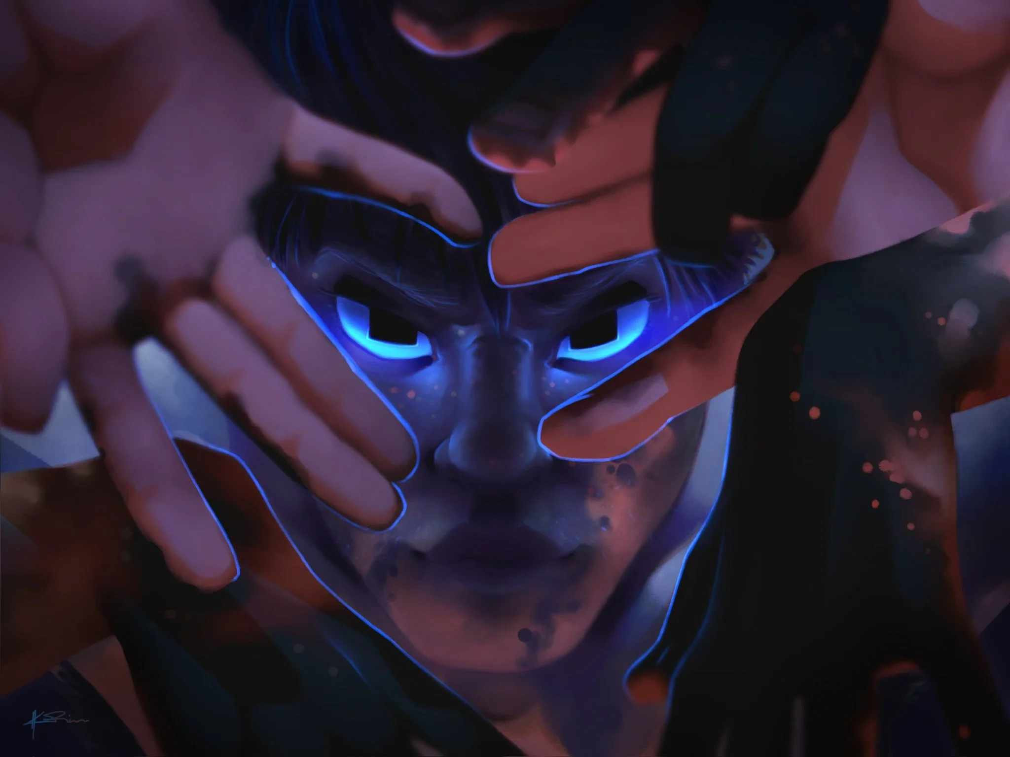 An animated woman with long blue hair, wearing a brown dress, holds a glowing orb in her hands at dusk. The scene features mountains, an orange sky, and a field of tulips.