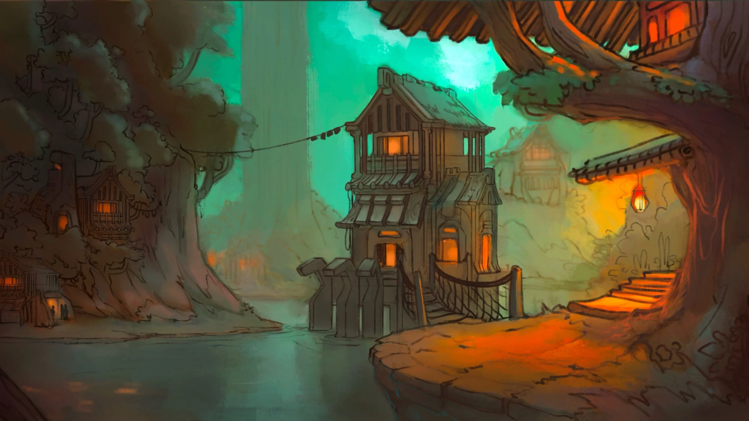 a collection of concept art images for 'Emburre', showcasing architecture studies including a mystical hillside town with a large futuristic gate, an underground cavern, an interior of a busy indoor market with hanging fabrics, a river flowing throug
