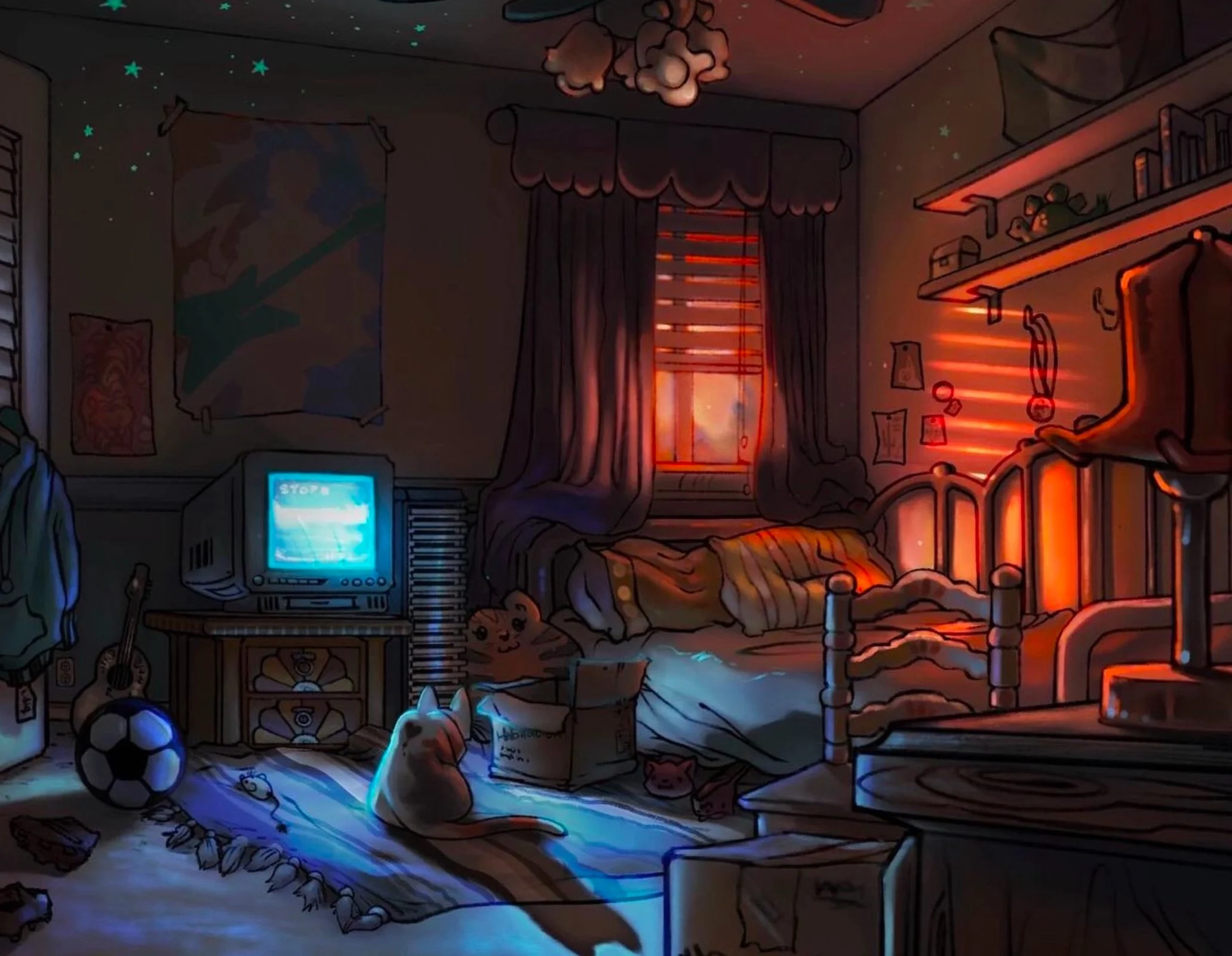Interior concept art of Buzzy Brew Cafe featuring a cozy, futuristic ambiance with warm lighting, a small robot with a blue light on the floor, shelves with supplies, a whiteboard with notes, and various seating areas.