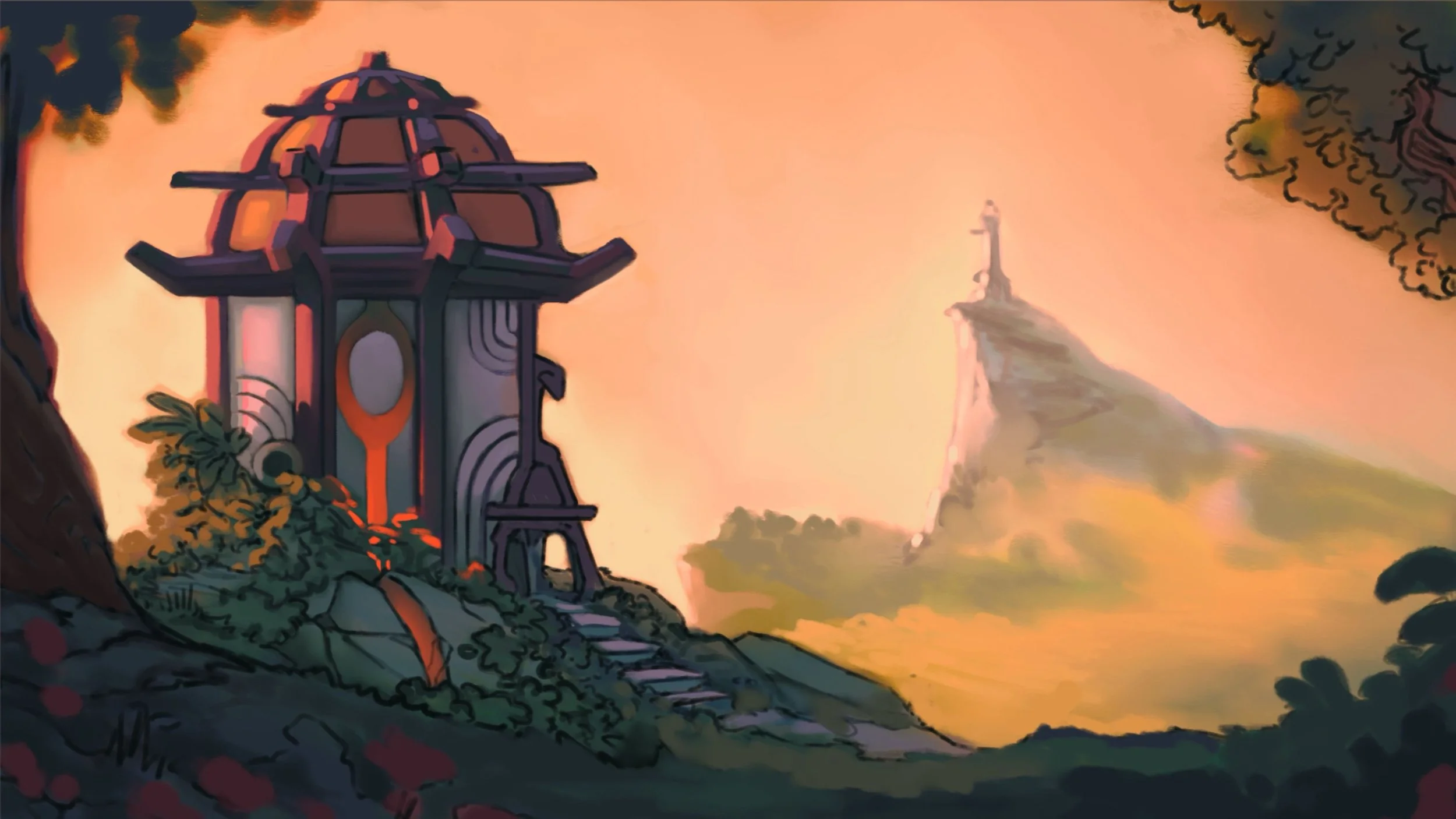 Concept art for Buzzy Brew Café exterior, showing a blend of modern and vintage architecture with steam and smoke coming from pipes and chimneys, illuminated by the setting sun. Three smaller sketches depict different angles and parts of the café's e